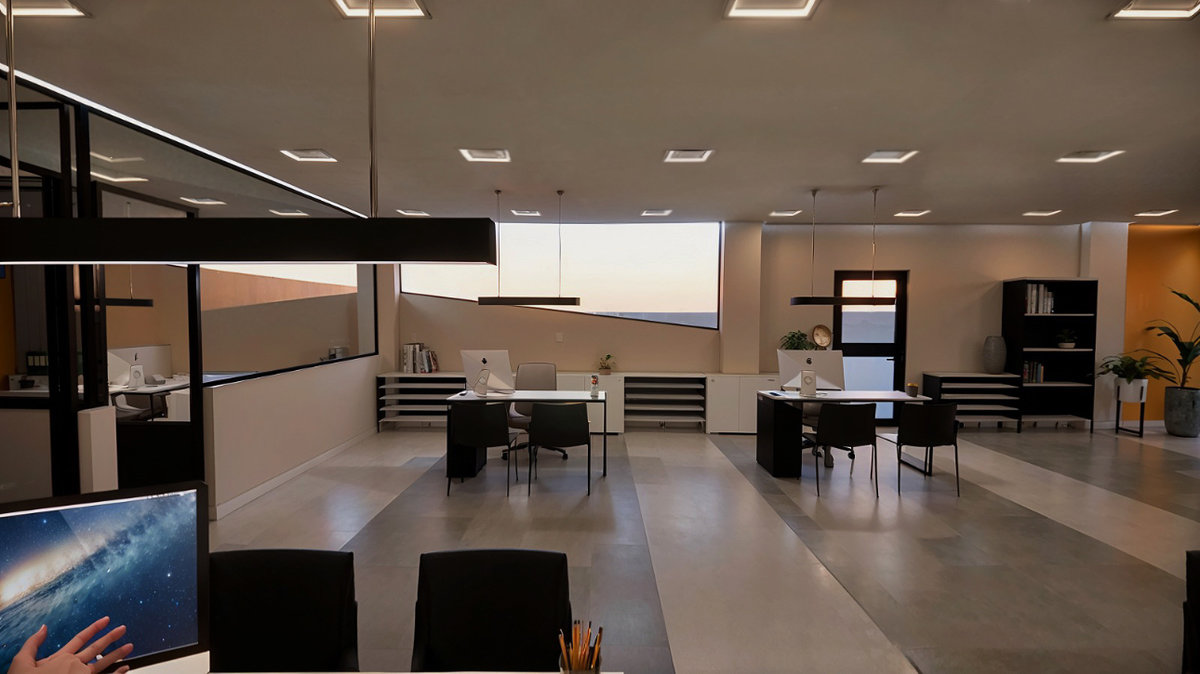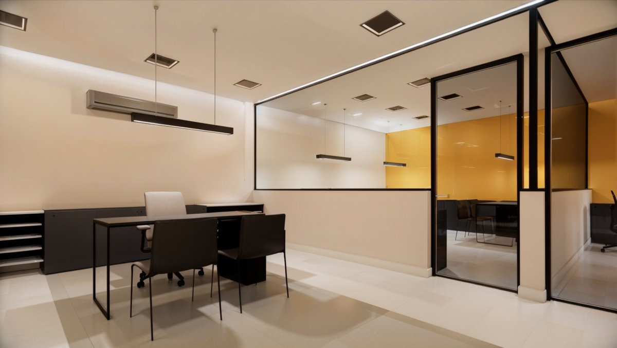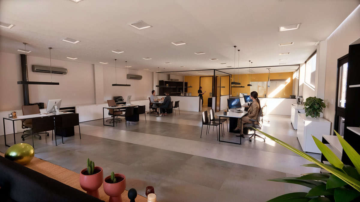 O layout aberto favorece a colaboração entre os setores, com estações de trabalho integradas, áreas de reunião flexíveis e uma copa pensada como ponto de respiro e troca. A presença de grandes aberturas proporciona abundância de luz natural, reduzindo a necessidade de iluminação artificial e contribuindo para um ambiente mais saudável.