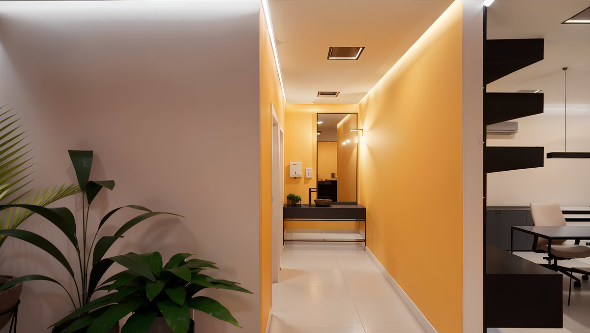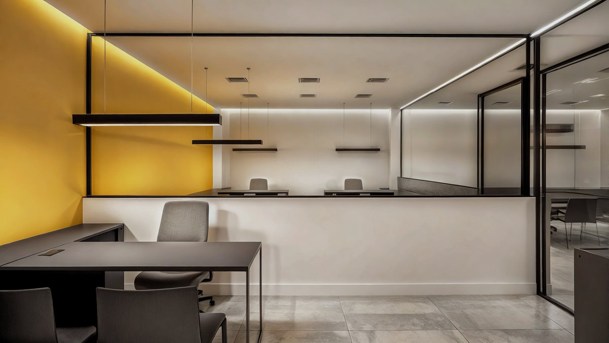 As cores neutras e os pontos de cor, como o amarelo nas paredes da copa e fundo da recepção, equilibram sobriedade e vitalidade. O projeto combina funcionalidade técnica com conforto visual e afetivo, refletindo a identidade contemporânea da empresa.