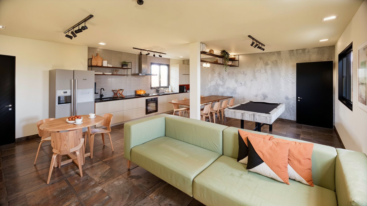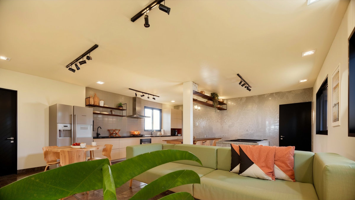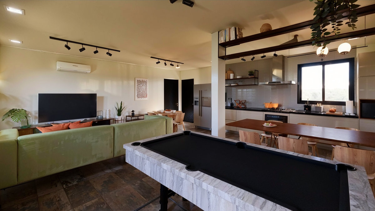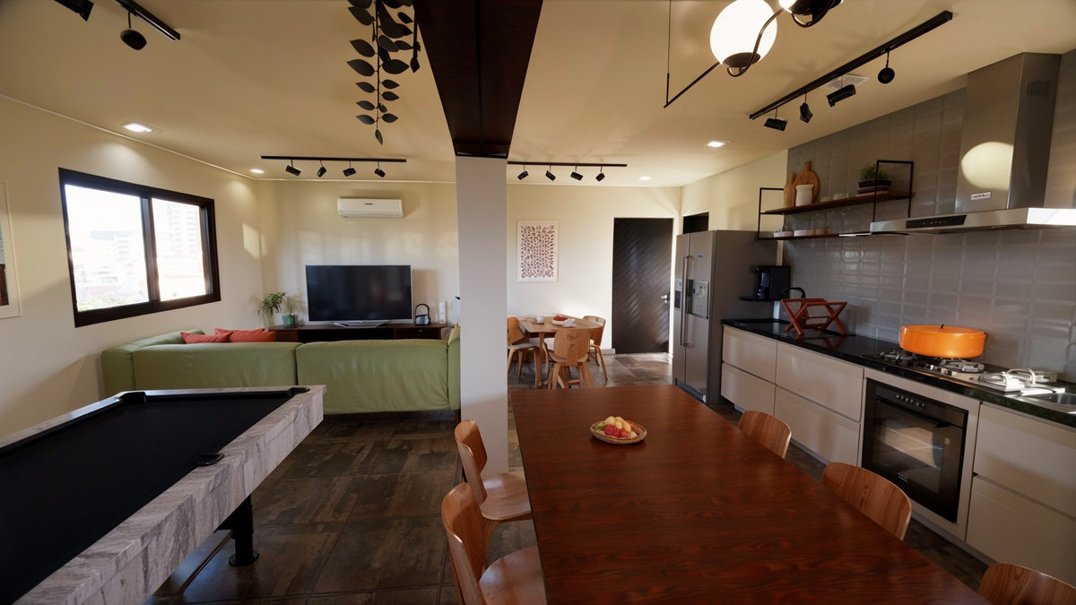 A proposta priorizou a criação de um ambiente funcional, acolhedor e visualmente agradável. A integração entre copa, área de estar, jantar e espaço de jogos promove flexibilidade no uso, permitindo desde refeições rápidas até momentos de descontração e convivência em grupo.