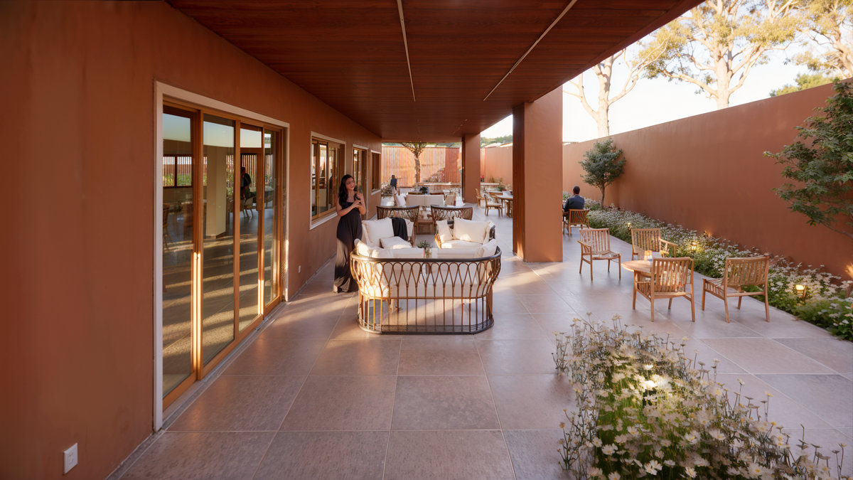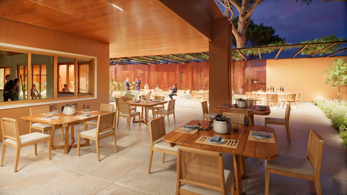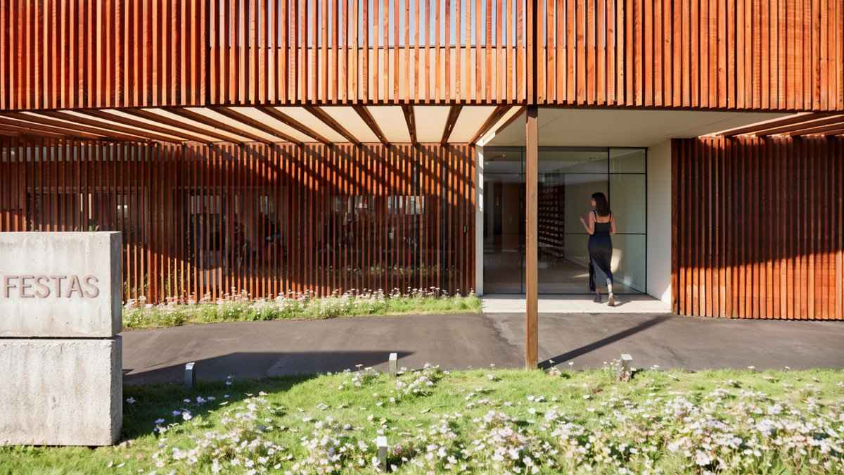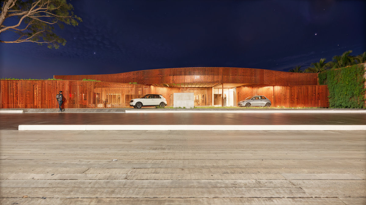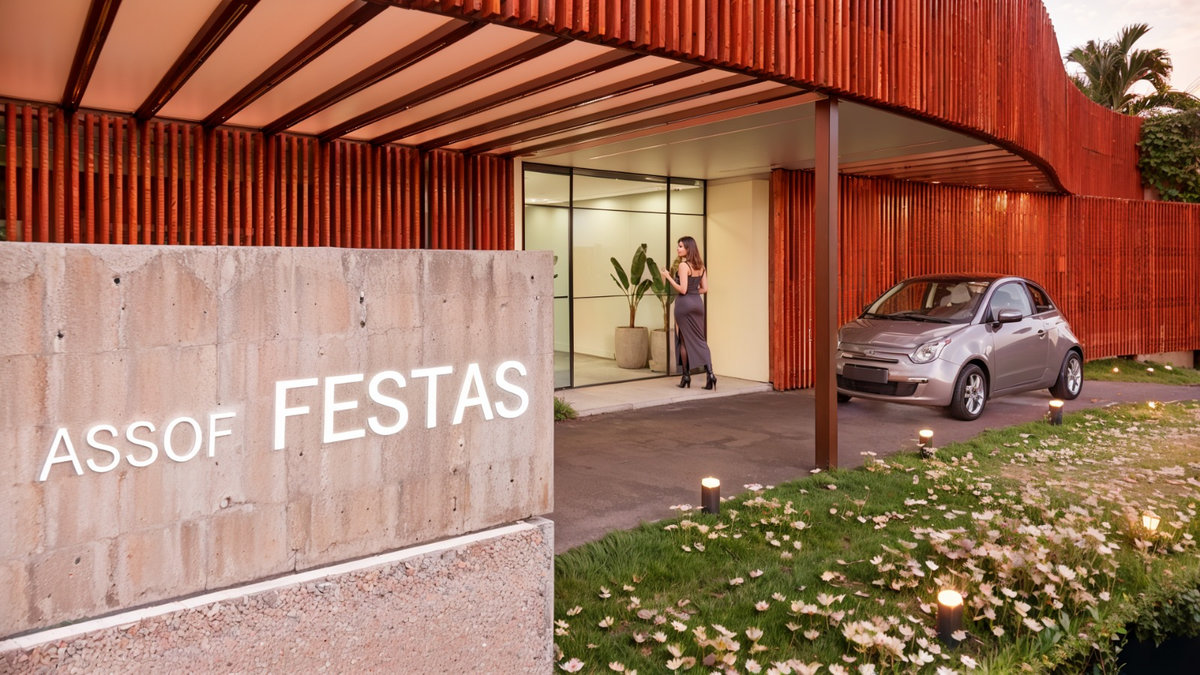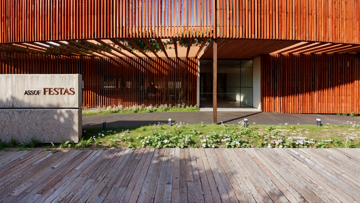 O brise de madeira que envolve a fachada cria ritmo, filtro de luz e privacidade, enquanto o paisagismo cuidadosamente posicionado reforça o vínculo com o entorno e a natureza. Com iluminação cênica, mobiliário sob medida e acabamentos de alta qualidade, o Espaço Oficial é um convite à celebração, um lugar pensado para encontros, memórias e pertencimento institucional.